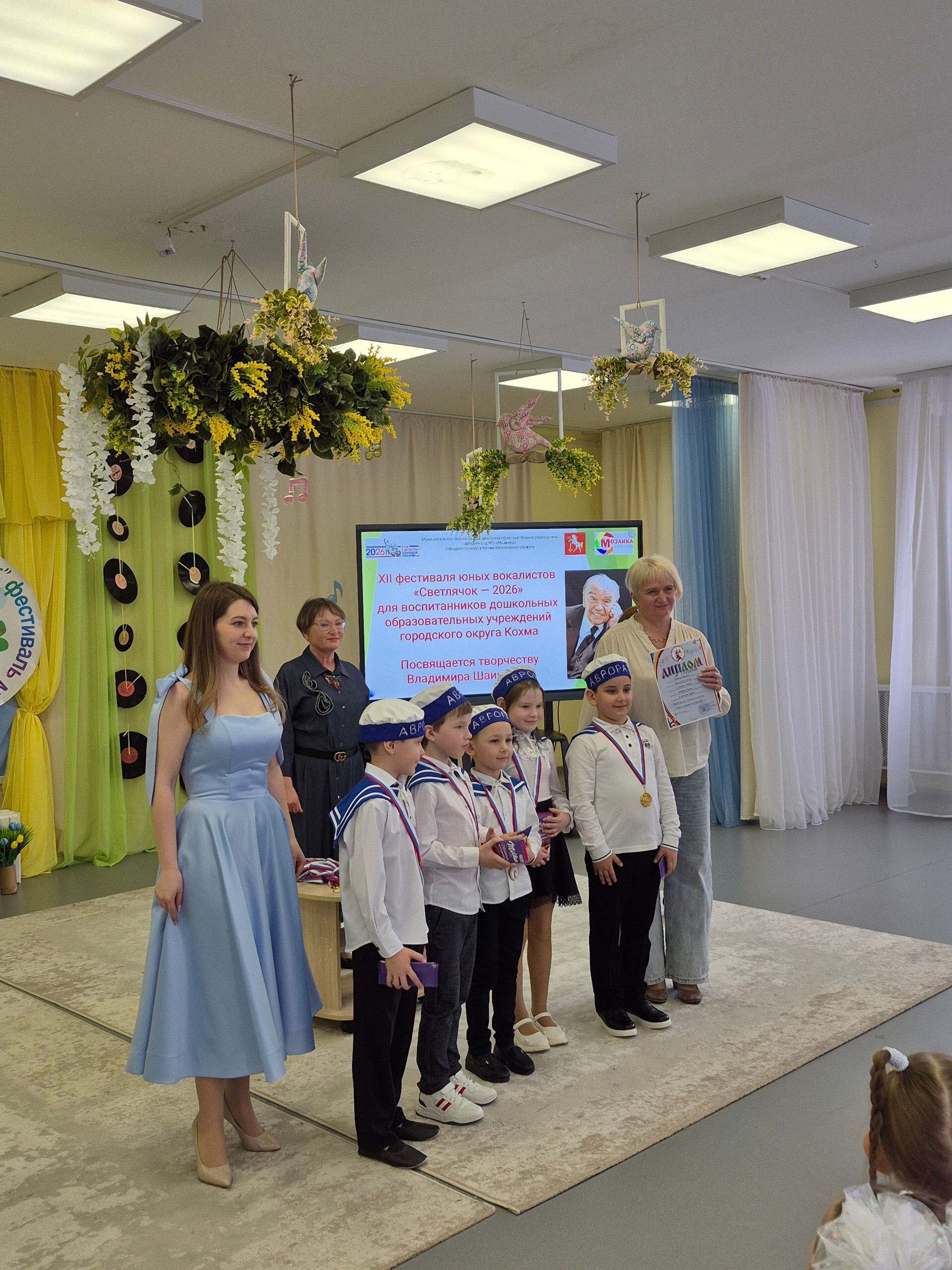 Захар Виноградов, Сейран Степанян, Артём Лобанов, Максим Комков и Мария Кочеткова из подготовительной группы «Родничок» (музыкальный руководитель Аникина Е. Ю., воспитатель Масленникова М. А.) достойно представили наш детский сад на 12-ом городском фестивале юных вокалистов «Светлячок-2026», посвящённый творчеству композитора В. Шаинского, который проходил на базе МБДОУ ДС 5 «Мозаика». Мы от души поздравляем ребят и выражаем огромную благодарность родителям воспитанников за поддержку и веру в таланты своих детей.